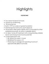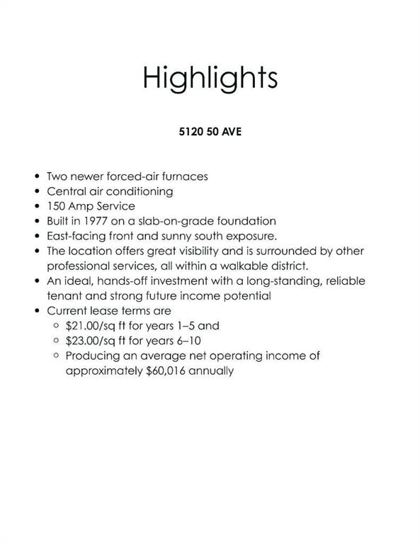 Here’s your chance to own a fully leased, stand-alone commercial property right in the vibrant core of Uptown Olds. Spanning 2703 sq ft, this solid masonry building has been home to a trusted physiotherapy clinic for over two decades. The tenant recently committed to a brand-new 10-year Triple Net lease—complete with a rent increase at the halfway mark—meaning they cover all operating costs, including taxes, insurance, and maintenance. For you, that translates into a dependable, low-maintenance income stream. Inside, the space is bright, welcoming, and impressively well-kept. The layout includes five private treatment rooms, a large open exercise area with two additional treatment spaces, a professional reception and waiting area, an office, file storage, two washrooms (one with a shower), and a laundry room. Comfort is ensured with three forced-air furnaces and central air conditioning that have been regularly maintained. Built in 1977 on a slab-on-grade foundation, the property benefits from excellent natural light thanks to its east-facing front and sunny south exposure. The location offers great visibility and is surrounded by other professional services, all within a walkable district. Current lease terms are $21.00/sq ft for years 1–5 and $23.00/sq ft for years 6–10, producing an average net operating income of approximately $60,016 annually. An ideal, hands-off investment with a long-standing, reliable tenant and strong future income potential. Solid tenant already in place with a long lease, and positive cash flow.